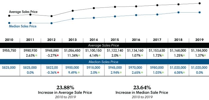 The past decade for Bethesda detached homes was overall positive. The average sale price of a single-family home rose by 23.88% as the median sale price similarly increased by 23.64%. The first couple of years of the decade were more volatile, as the market was just beginning to recover from the great recession of 2008. The strongest year was 2013 with double digit gains in the average sale price of a home. The years 2015 through 2019, however, were defined by a slow and steady increase year-to-year.