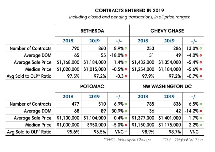 Similarly, the number of contracts entered in 2019 in Chevy Chase, MD was 286, up from 253 in 2018, a 13% rise. Avg DOM was 49, down from 51 in 2018, and the Average Sold to Original List Price Ratio was 97.7%, virtually no change from 2018.
