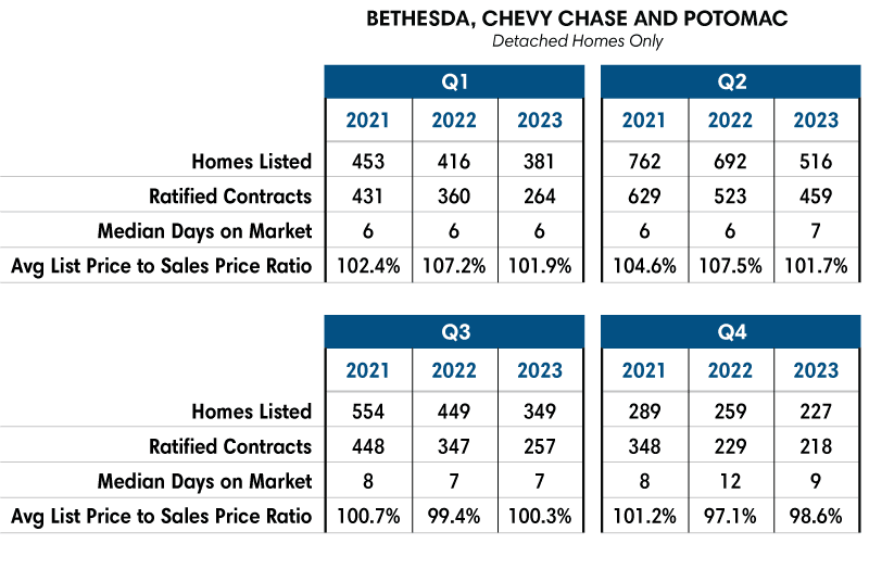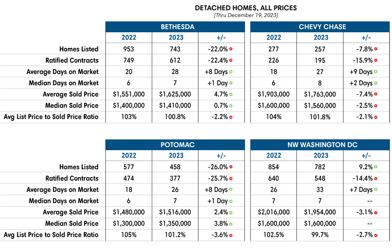 Consistently across the region, we saw big drops in the number of new listings entering the market, in Bethesda 22% fewer homes were offered for sale compared with 2022. Similarly, the number of contracts entered decreased significantly – Potomac with approximately 26% fewer contracts in 2023 than in 2022, Bethesda with 22.4% fewer contracts, NW DC with a nearly 15% drop, and lastly Chevy Chase MD with 16% fewer contracts.