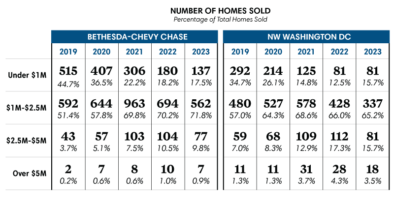 On the other end of the spectrum, though the number of transactions is not large, home sales over $5M represent a 400% increase in Bethesda-Chevy Chase and over 150% in NW DC between 2019 and 2022. (The drop in 2023 can be attributed to the overall dramatic decrease in buyer activity as discussed before).