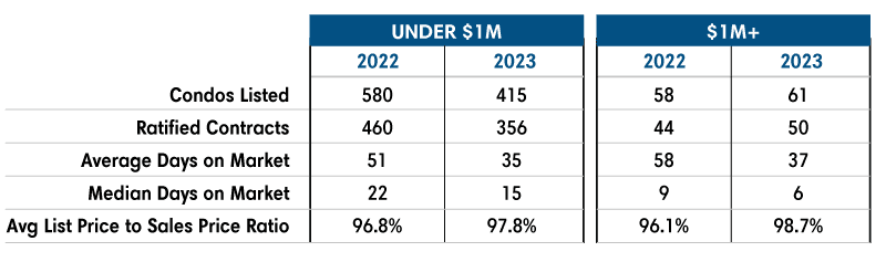 In a reverse trend, the higher-end condo market in Bethesda and Chevy Chase (defined as listed at $1M or more), saw some gains after a number of years where demand was low enough, presenting a challenge to sellers. In 2023, all indicators for this segment of the condo market outperformed the previous year; more listings were entered, nearly 14% more contracts were signed, and the Average and Median Days on the Market dropped by over 30%. The Average Sold Price to List Price Ratio got a bump of 2.5 points to 98.7% not quite at 100% yet, but far better than 96.1% in 2022.