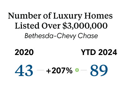 As I write this report, there are 28 detached homes for sale in Bethesda and Chevy Chase priced between $3 million and $5 million, along with 18 homes above $5 million, totaling 46 properties. The growth of the luxury and ultra-luxury home segments in Bethesda-Chevy Chase is remarkable. Year to date, 89 homes have been listed over $3 million, and this number is expected to increase in the last quarter of the year.