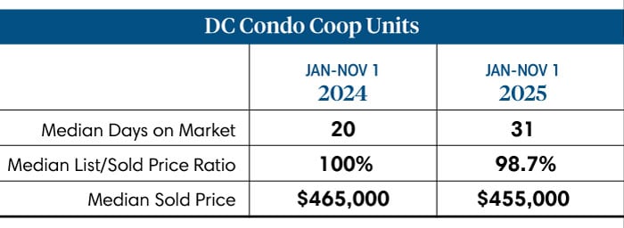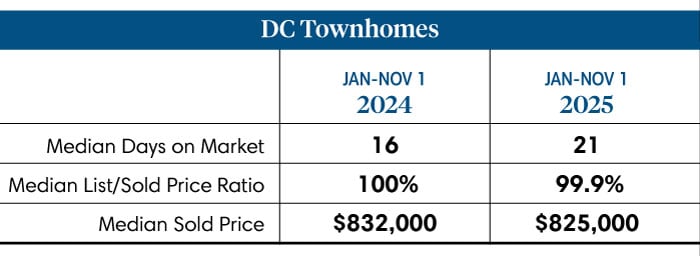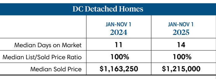 The D.C. real estate market has been in a period of transition this year. Over the first 10 months of 2025, between January and November 1, 2025, 5,345 contracts (single-family, condos, and rowhomes) were signed, a negligible increase from the 5,317 contracts signed during the same period of 2024. The change in the weighted median sales price was also negligible, moving from $734,250 in 2024 to $735,374 in 2025.