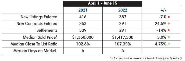 A quick look at Q2-2021 versus Q2-2022 (for the sake of this report, April 1 – June 15), for detached homes in Bethesda-Chevy Chase, shows what we all know to be true, the inventory overall shrunk further by 7% and that median home prices have increased by 5% comparatively.