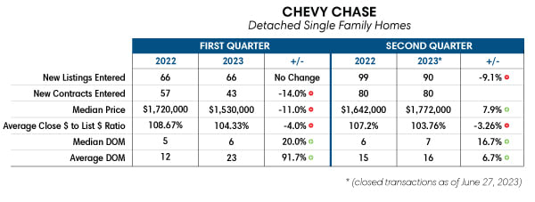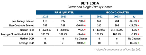 A closer look at first (Q1) and second quarters (Q2) 2023 compared with the first two quarters of 2022 in Bethesda shows that the number of new homes to enter the market (listings) dropped. We see a major decrease – 35% less – in inventory in Q2 compared with the same period in the previous year. The number of transactions also significantly decreased in Q1 and in Q2 – approximately 20% fewer – compared with 2022. The combination of shrinking inventory and a measurable decrease in buyer activity resulted in price stabilization. Another interesting and noteworthy indicator is the Sold Price to List Price Ratio. The data clearly shows that before the interest rate hikes, the ratio, on average, was 106-108%, a rate that declined as interest rates rose.