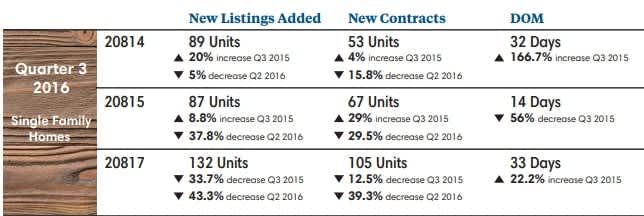 In Chevy Chase, MD, DOM dropped to 14 days in Q3 2016, a 56% drop compared with same period in 2015 - a sign of a strong seller market! Number of new listings entering the market was 87 homes, an 8.8% increase from 2015, and a 37.8% drop from the previous quarter. The number of homes which went under contract during Q3 was 67, compared with 95 during the previous quarter, and a 29% increase from Q3 in 2015. All great indicators for zip 20815 which continues to outperform neighboring MD zips.